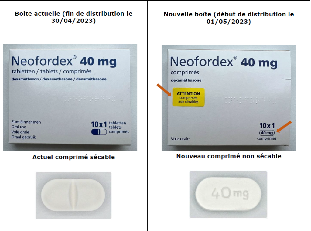 La barre de sécabilité des comprimés de Neofordex® (dexaméthasone) 40 mg a été supprimée. Le comprimé Neofordex® ne doit être administré qu’à la posologie de 40 mg. Pour les patients pour lesquels une dose de 20 mg est nécessaire, une autre spécialité à base de dexaméthasone doit être prescrite. Il convient de conseiller aux patients de ne pas couper les comprimés et de les conserver dans leur blister d’origine jusqu’à leur administration. Les comprimés ont été modifiés en des comprimés non sécables, présentant une gravure « 40 mg » sur l’une des faces. L’information produit ainsi que le conditionnement secondaire (boîte) ont été mis à jour en conséquence.