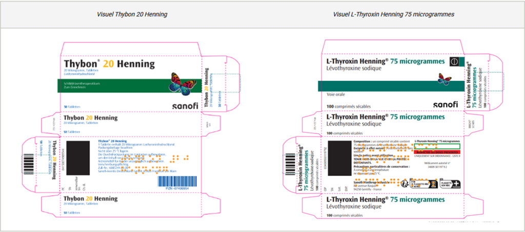 Les boîtes du médicament importé Thybon 20 Henning® (liothyronine) et du médicament autorisé en France L-Thyroxin Henning® (lévothyroxine), tous deux du laboratoire Sanofi, se ressemblent fortement.